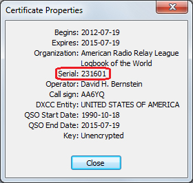 TQSL displays a Callisign Certificate's serial number when you direct it to display that Callsign Certificate's properties: