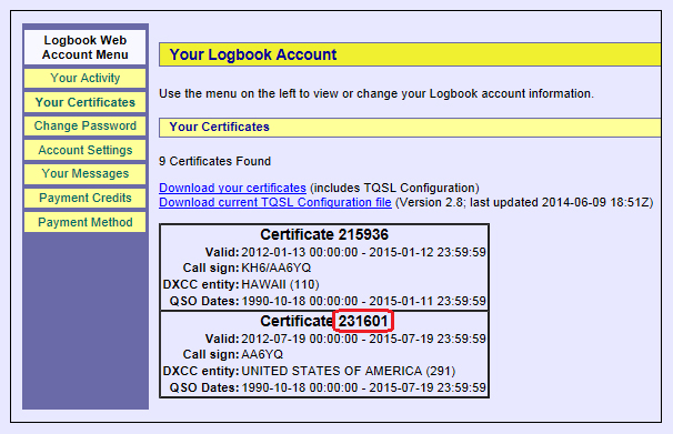 | 3. | In the Logbook Web Account Menu on the left, click the Your Certificates button; LotW will display your Callsign Certificates, with the serial number for each: |