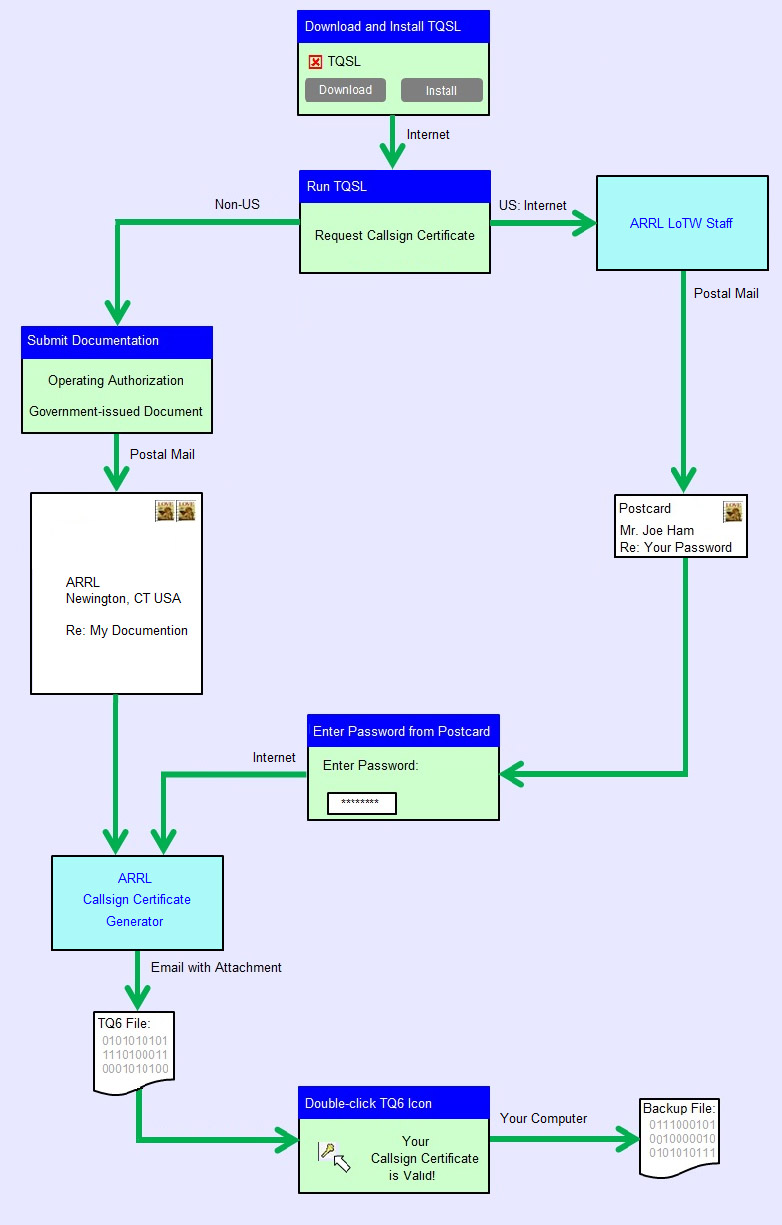 - Light-blue rectanges represent actions taken by the ARRL's LoTW staff