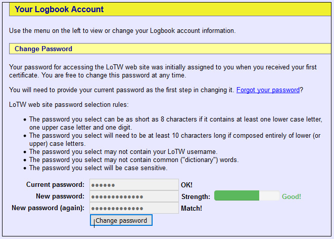 - After devising a new case-sensitive password that conforms to the stated rules, specify your Current password and specify your new password in the New password and New password (again) boxes; then click the Change password button.