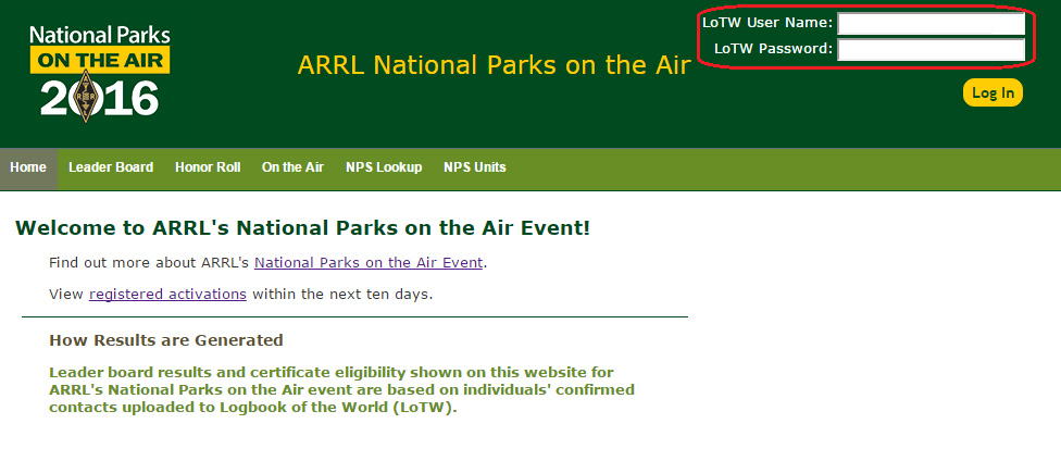 First,log in to the NPOTA Home Page with your LoTW username and password: