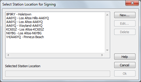 5. In the Select Station Location for Signing dialog, select the Station Location that specifies the Callsign and operating location used to make the log file's QSOs, and click the Ok button.