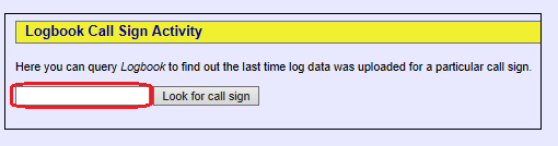 | 3. | Type your QSO partner's callsign into the red-highlighted box, and click the Look for call sign button; LoTW will either report No log data found, if your QSO partner is not an LoTW participant, or the date and time your QSO parner most recently submitted QSOs to LoTW.