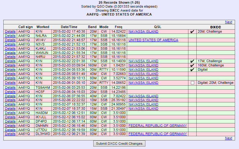 | 2. | LoTW responds by displaying a table containing the first 25 confirmed QSOs after the Starting Date you specified; you can view more by clicking the hyperlinked word Next in the upper-right or lower-right corner: |
