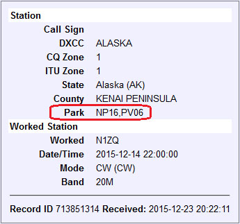 | If your QSO partner is an Activator in the ARRL's 2016 National Parks On The Air event, the details will include the ARRL code for each confirmed Park. In the example below, the Activator was operating from a location within both NP16 (Denali National Park) and PV06 (Denali Preserve) : | |