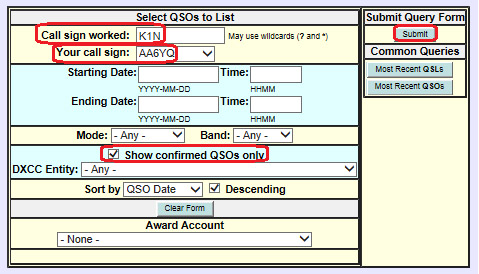 Only confirmed QSOs made with the specified station callsign are shown. It's easy to specify QSO selection criteria and click the Submit button to see the results; the process is entirely non-destructive, so don't be hesitant to experiment. |