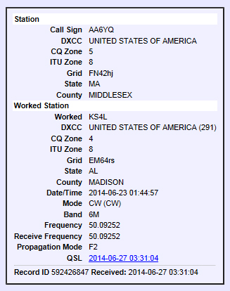 | In the above screen shot, clicking the red-highlighted word Details for the QSO with KS4L displays the details of this confirmed QSO: | |