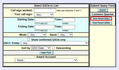 | 4. | Click the Most Recent QSLs button, highlighted in red in the screen shot below: |