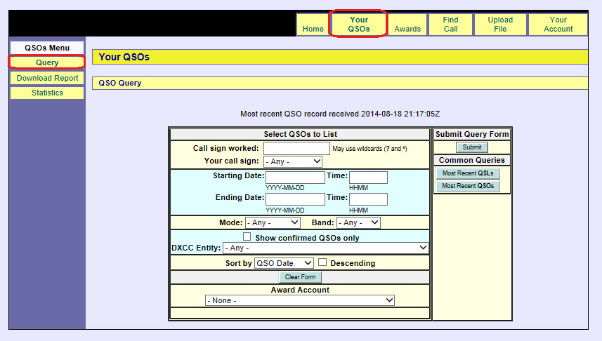 | 3. | in the QSOs Menu in the Your QSOs tab's upper-left corner, click the Query button |