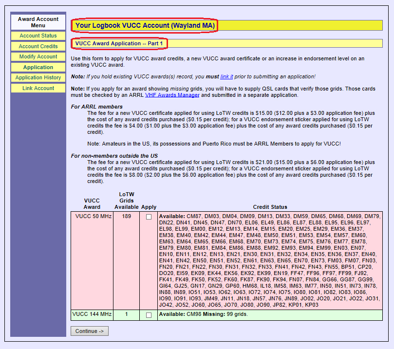 | 2. | Click the Award tab, and in the Your LoTW ARRL VUCC Accounts section on the left side of the Logbook Awards page, select the VUCC Award Account for which you intend to submit an application:
