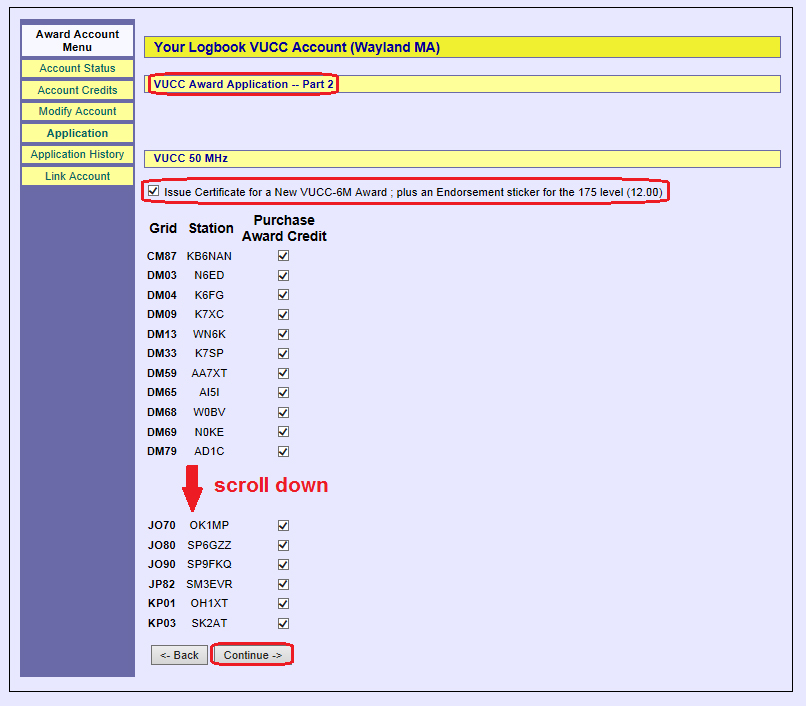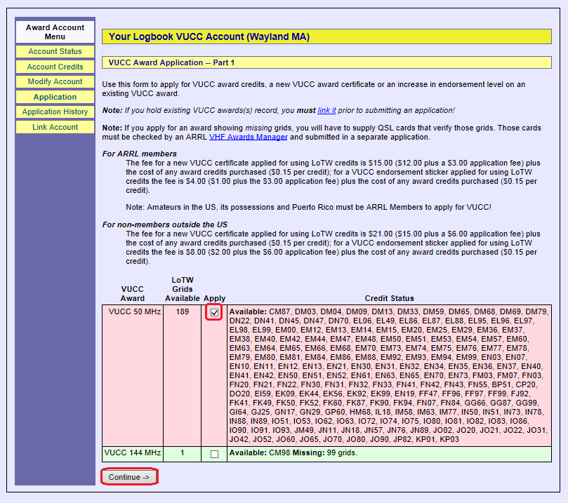 | 4. | Scroll to the bottom of the page, and click the Continue button; LoTW will display Part 2 of the VUCC Award Application, on which you can confirm the VUCC Certificates, Endorsement Stickers, and Award Credits to be purchased: |
