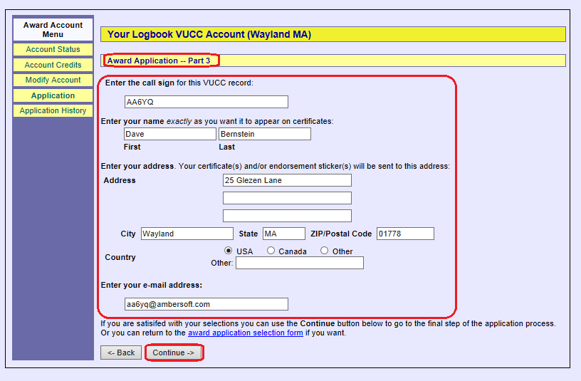 | 5. | After confirming the selected purchases in Part 2, click the Continue button at the bottom of page, and LoTW will display Part 3 of the VUCC Award Application: |
