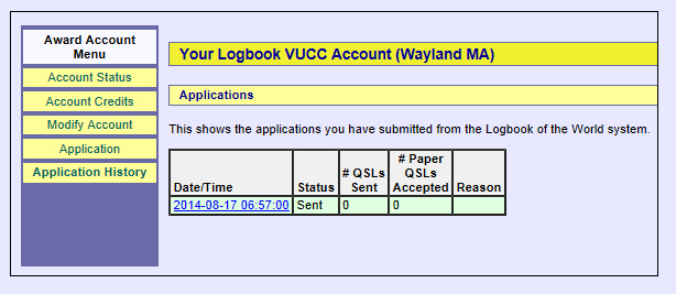 | Clicking on a hyperlinked Date/Time in the table in the above screen shot will display the details of that application. The # Paper QSLs Accepted and Reason columns are not used |