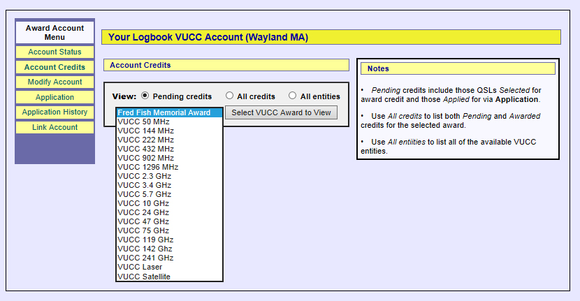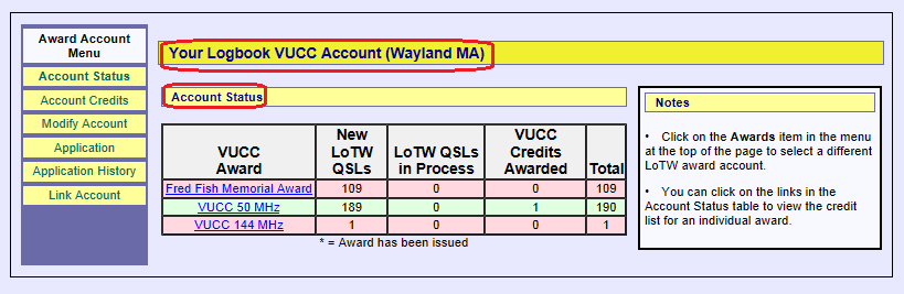 | 2. | Click the Award tab, and in the Your LoTW ARRL VUCC Accounts section on the left side of the Logbook Awards page, select the VUCC Award Account whose status you wish to view:
