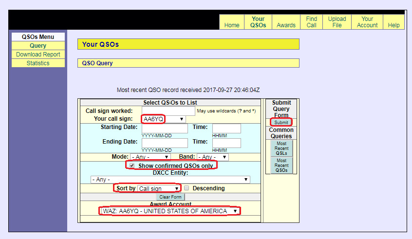 | When you proceed to submit a WAZ application, all QSOs with a black checkmark to the left of their WAZ column will appear as candidates. |