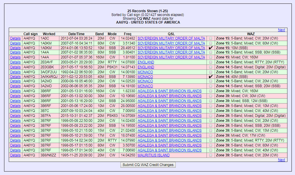 The WAZ column in the above table identifies QSOs that are either candidates for a WAZ award or have already been submitted for a WAZ award; in such QSOs, the column to the left of the WAZ column indicates their status: