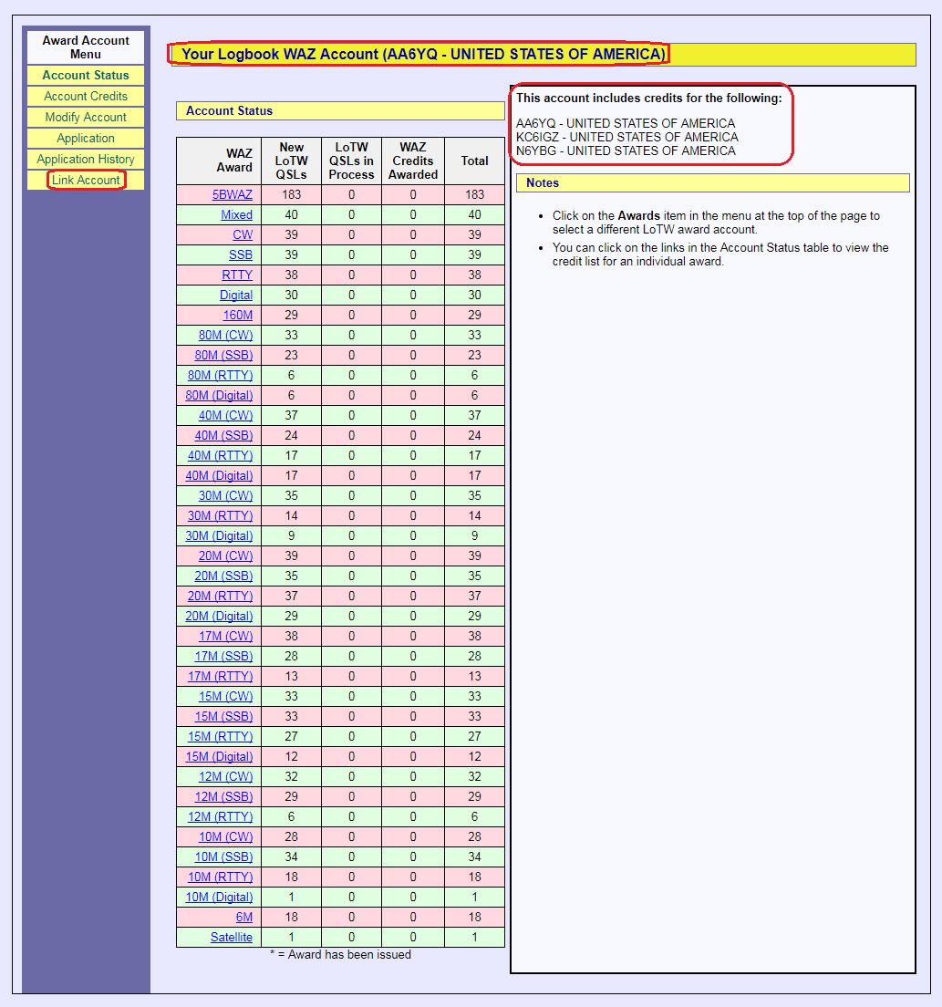 | Repeat steps 1-5 above to link each LoTW WAZ Award Account associated with a entity from which you've operated to your WAZ Record for that entity. |