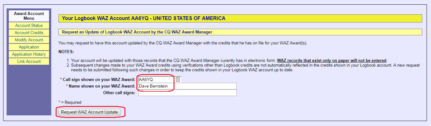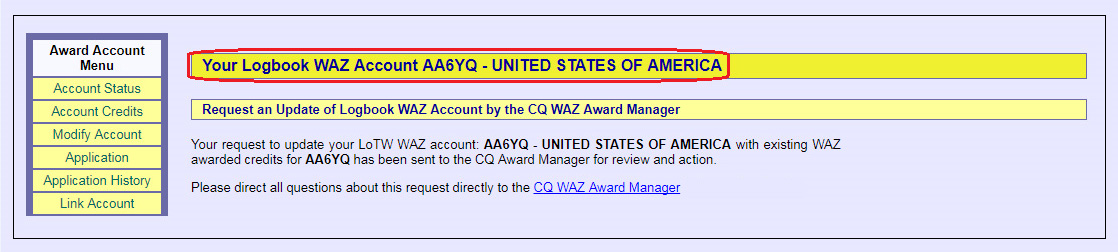 | 4. | Clicking the Clicking the Request WAZ Account button will submit a request to the CQ WAZ Award Manager to link the specified WAZ Award Account to your WAZ Record: |
