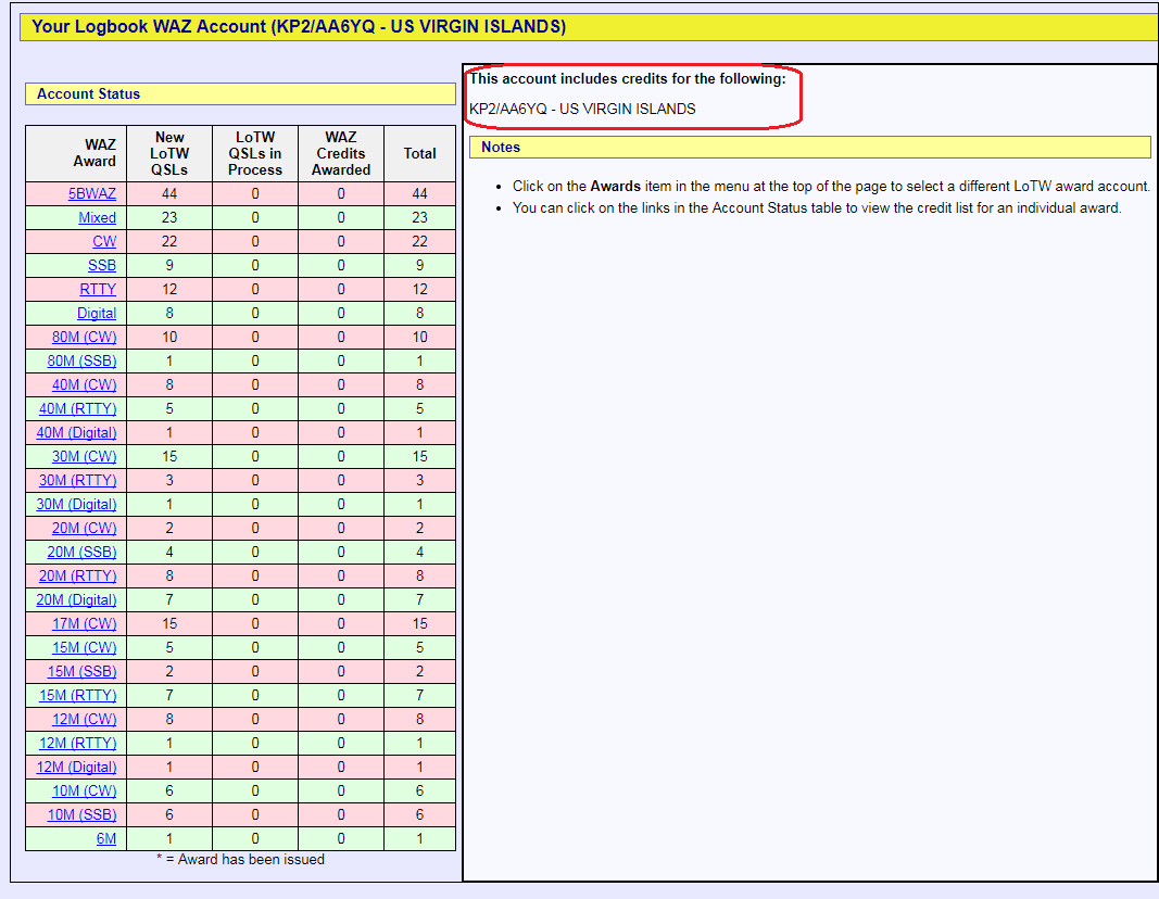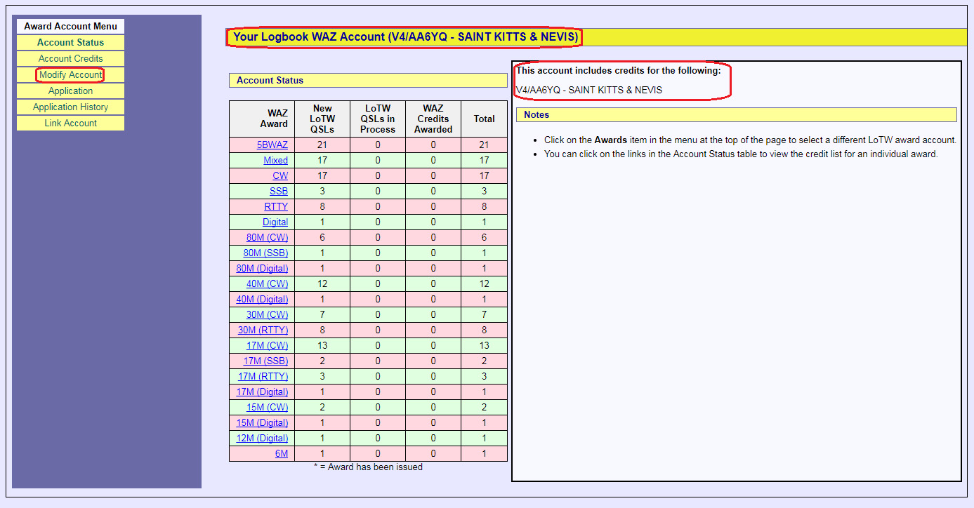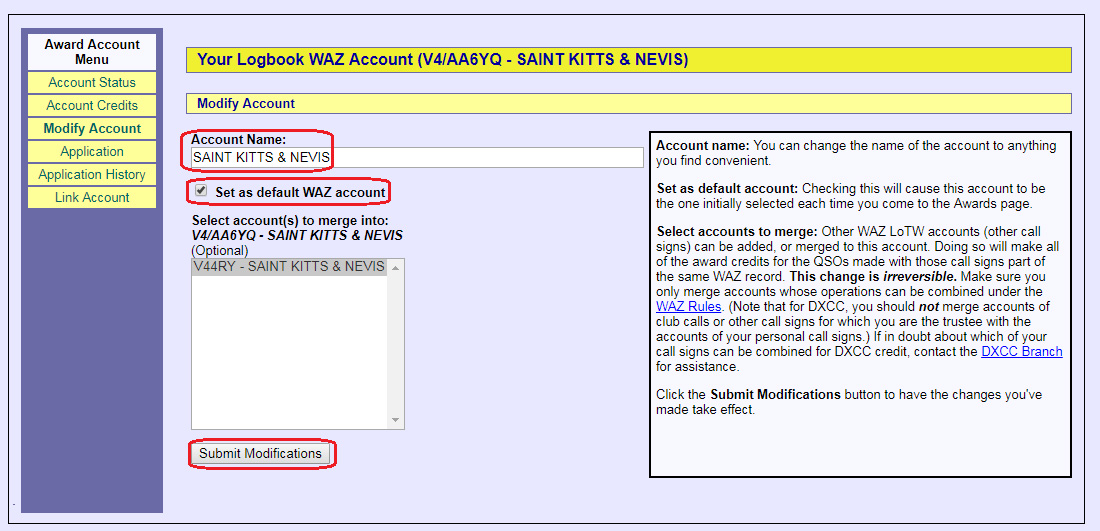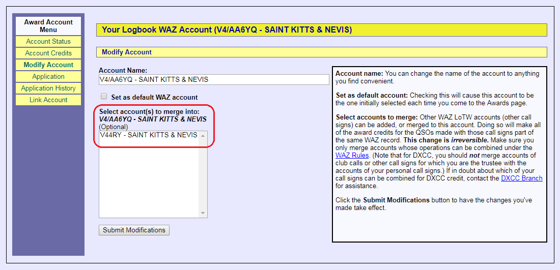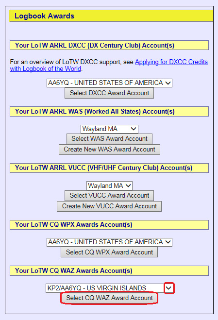 | Repeat steps 1-5 in the second example above to merge LoTW WAZ Award Accounts for each entity from which you've operated and hold more than one such Account. |