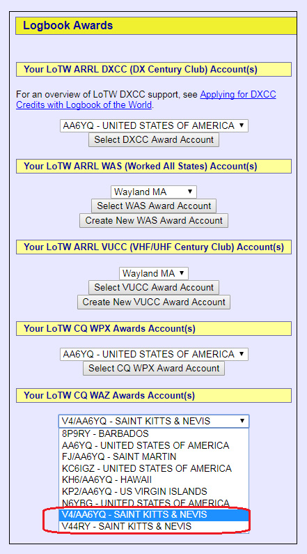 | 1. | In this second example, opening the selector immediately above the Select WAZ Award Account button displays 9 LoTW WAZ Award Accounts. Note the two accounts associated with SAINT KITTS & NEVIS, highlighted in red in the screen shot below. Since these are both personal Accounts, they should be merged into a single Account. |