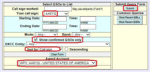 | When you proceed to submit a WPX application, all QSOs with a black checkmark to the left of their WPX column will appear as candidates. |