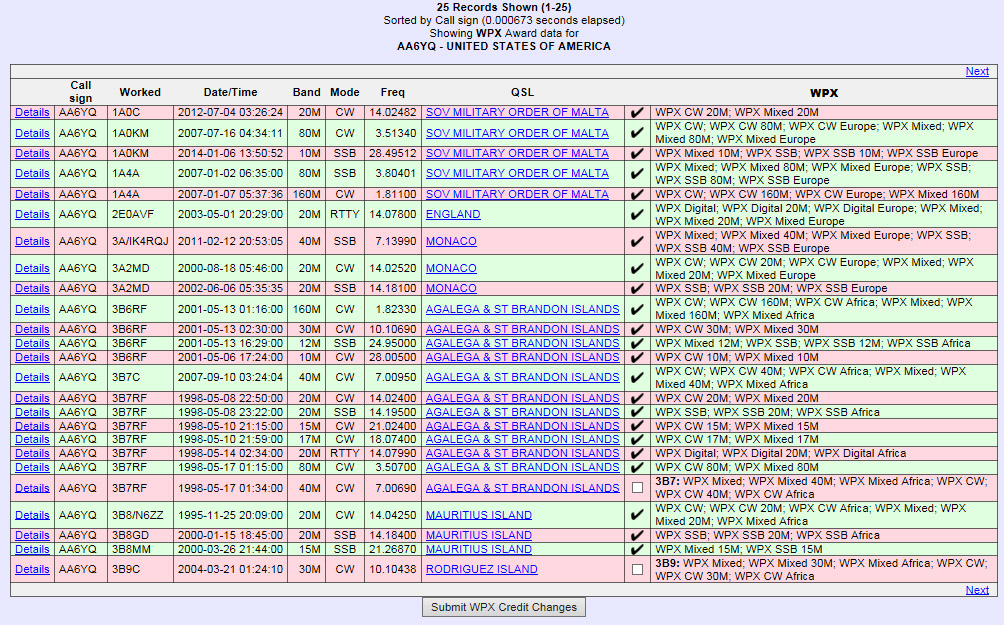 The WPX column in the above table identifies QSOs that are either candidates for a WPX award or have already been submitted for a WPX award; in such QSOs, the column to the left of the WPX column indicates their status:
