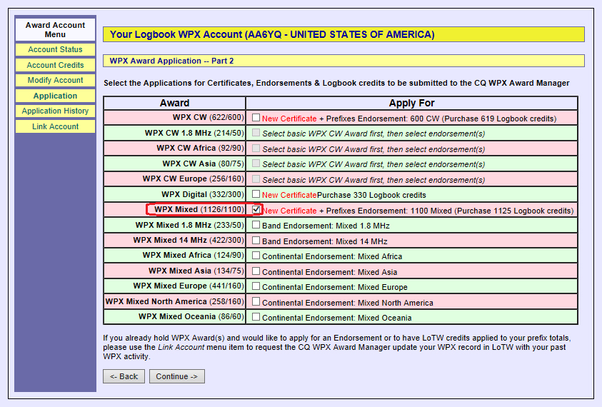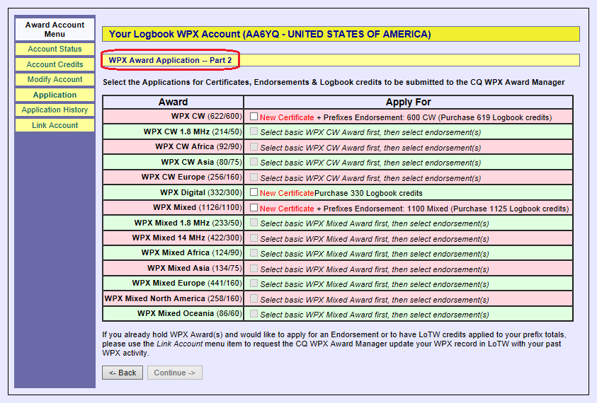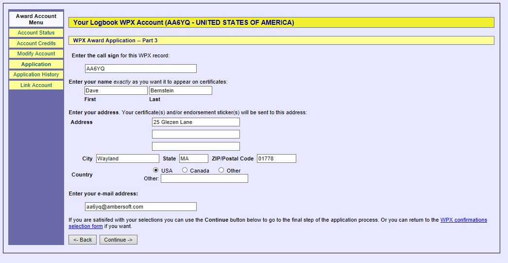 Proceed by clicking the Continue -> button to display the WPX Award Application -- Part 4 page: |