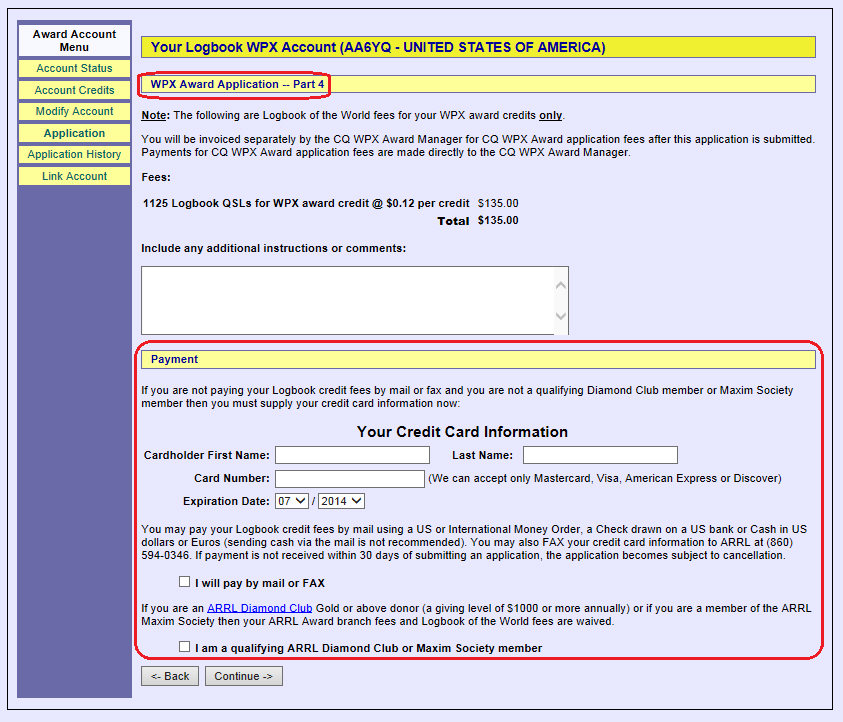 | 9. | The fee for LoTW services is $.12 for each confirmation submitted for WPX Award Credit. Specify your payment details, and click the Continue button at the bottom of the page; LoTW will display a summary of your application.