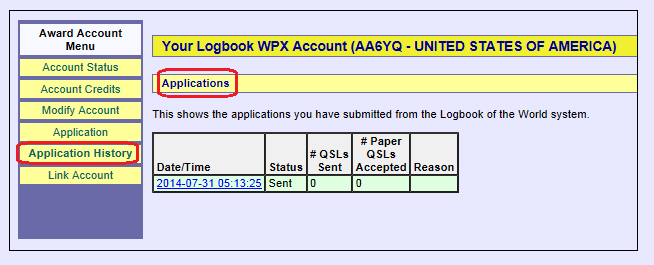 Clicking on a hyperlinked Date/Time in the table in the above screen shot will display the details of that application. The # Paper QSLs Accepted and Reason columns are not used. |