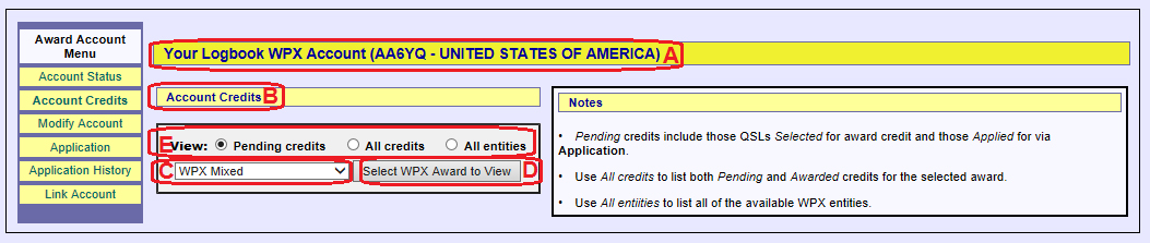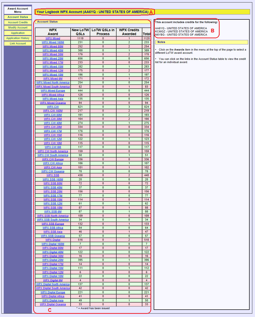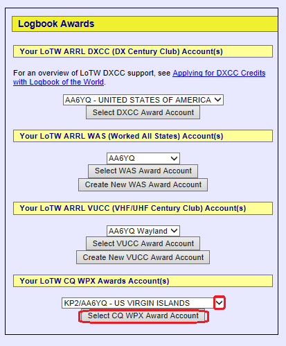 | 2. | Click the Awards tab, and in the Your LoTW ARRL WPX Accounts section on the left side of the Logbook Awards page, select the WPX Award Account whose status you wish to view:
